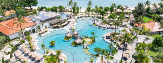 「メリア プロサニ」の庭園とラグーンプールを囲むような客室棟は、ジャワの豊かな伝統を醸し出す優美なデザインとなっており、街の喧騒の中にありながら心休まるオアシスのような雰囲気です。