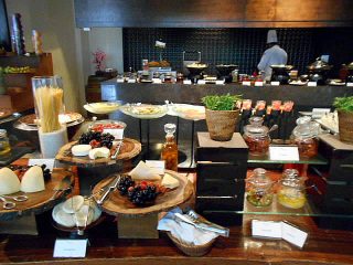 たっぷり1時間のモーニング ヨガで、お腹もすいたので朝ごはん。フェアモントの朝ごはんは、ブッフェとアラカルトメニューから選べ、フレッシュジュースや季節のフルーツを使ったヨーグルトの種類も豊富です。